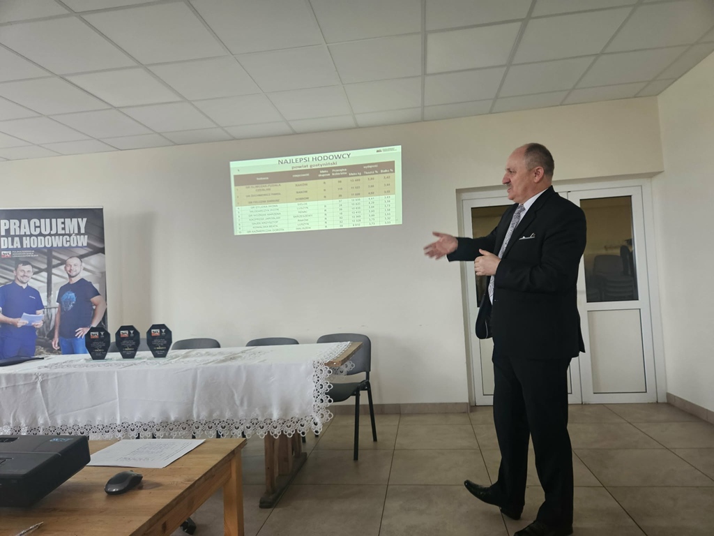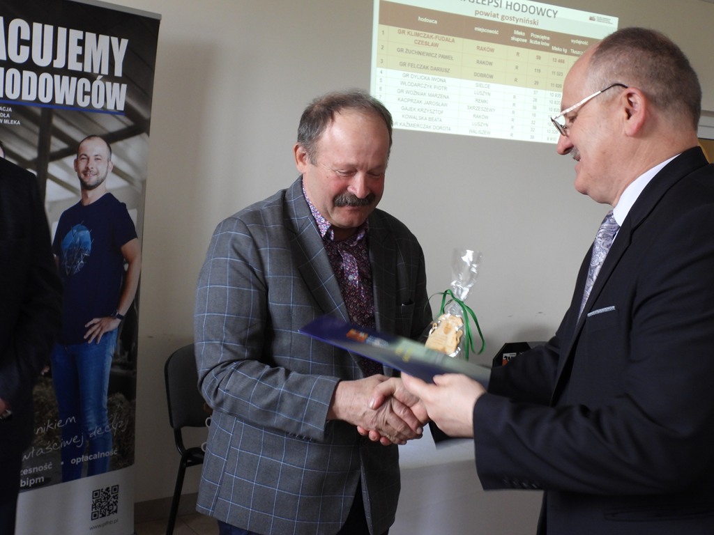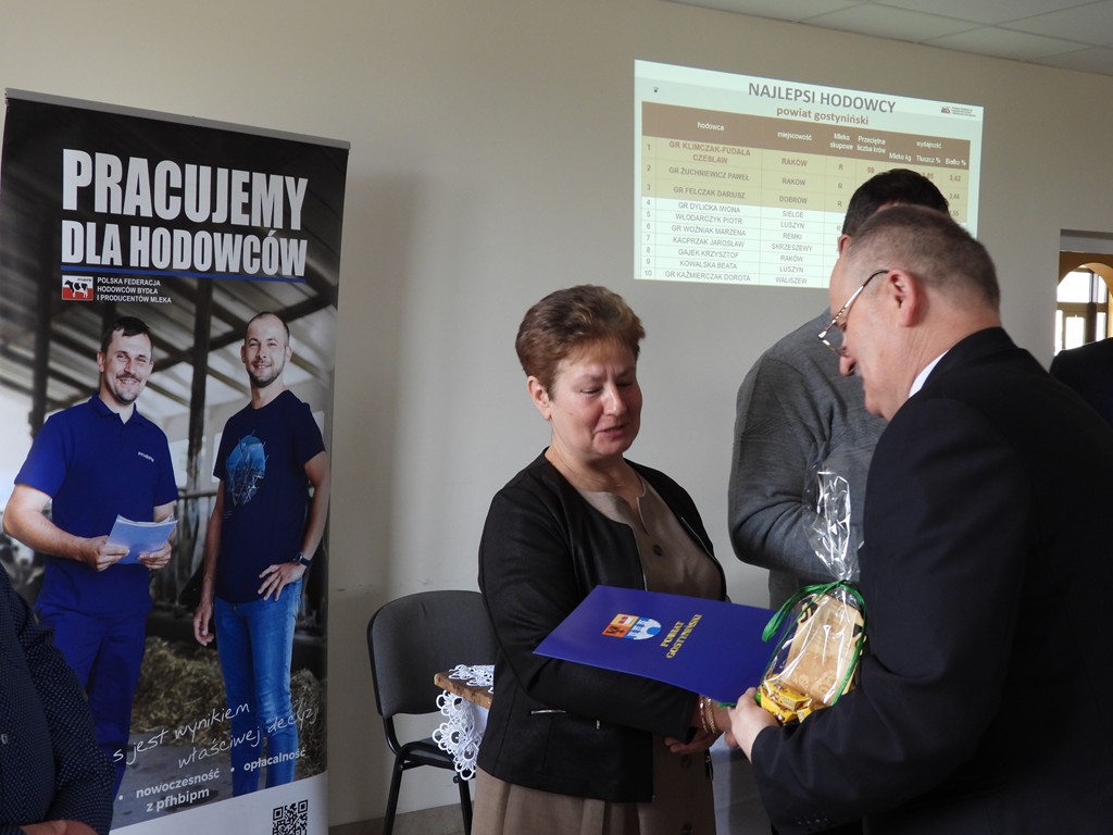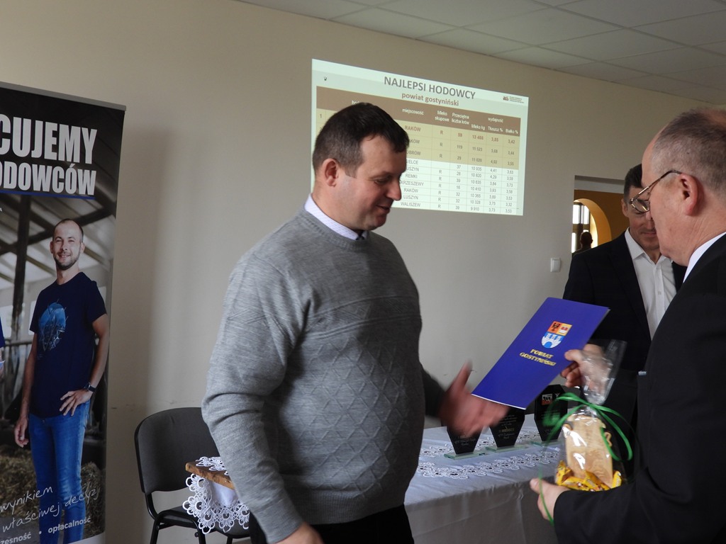 Dnia 25 marca br. w siedzibie OSP Pacyna odbyło się, po kilkuletniej przerwie, spotkanie podsumowujące wyniki produkcyjne i hodowlane rolników naszego powiatu zrzeszonych w Polskiej Federacji Hodowców Bydła i Producentów Mleka. W spotkaniu uczestniczył Starosta Gostyniński p. Andrzej Krzewicki, który podziękował zgromadzonym za ich całoroczny trud, wysoką wydajność produkcji oraz wkład w rozwój rolnictwa w naszym regionie. Starosta podkreślił, że praca hodowcy bydła wymaga nie tylko wiedzy, ale również wielkiego zaangażowania, w tym także wszystkich członków rodziny, oraz pasji. W dowód uznania wręczył okolicznościowe statuetki 10 najlepszym hodowcom bydła mlecznego w Powiecie Gostynińskim.